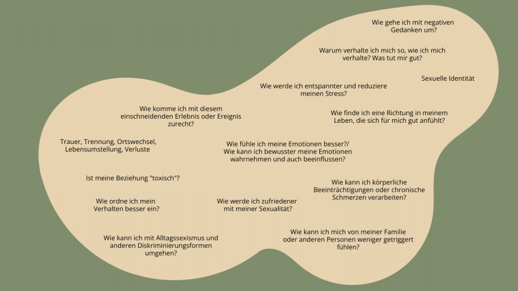 - Solltest du dich durch eine psychische Situation stark überfordert fühlen und hattest dir hier mehr erhofft, würde ich dich gerne auf die Infos am Ende dieser Seite verweisen. Dort sind einige Ansprechpartner:innen gelistet, die dir bei der Suche nach einem Therapieplatz zur Seite stehen können.